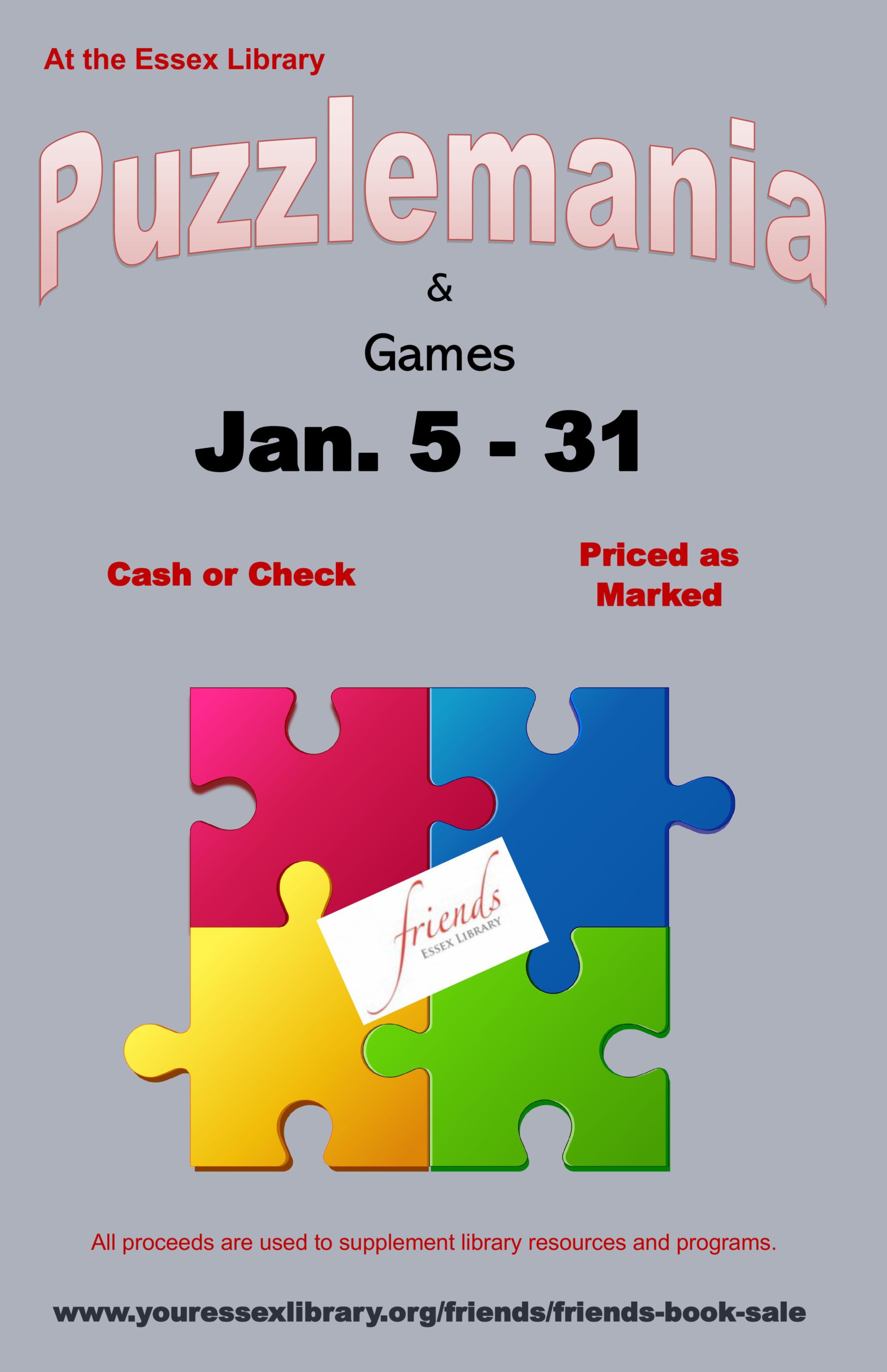 If your New Year’s resolution is to do more puzzles–we have got you covered! It is time once again for Puzzlemania at the Essex Library. We have collected many puzzles and games throughout the year and our shelves are overflowing with puzzles of every size, as well as games for those long winter nights.