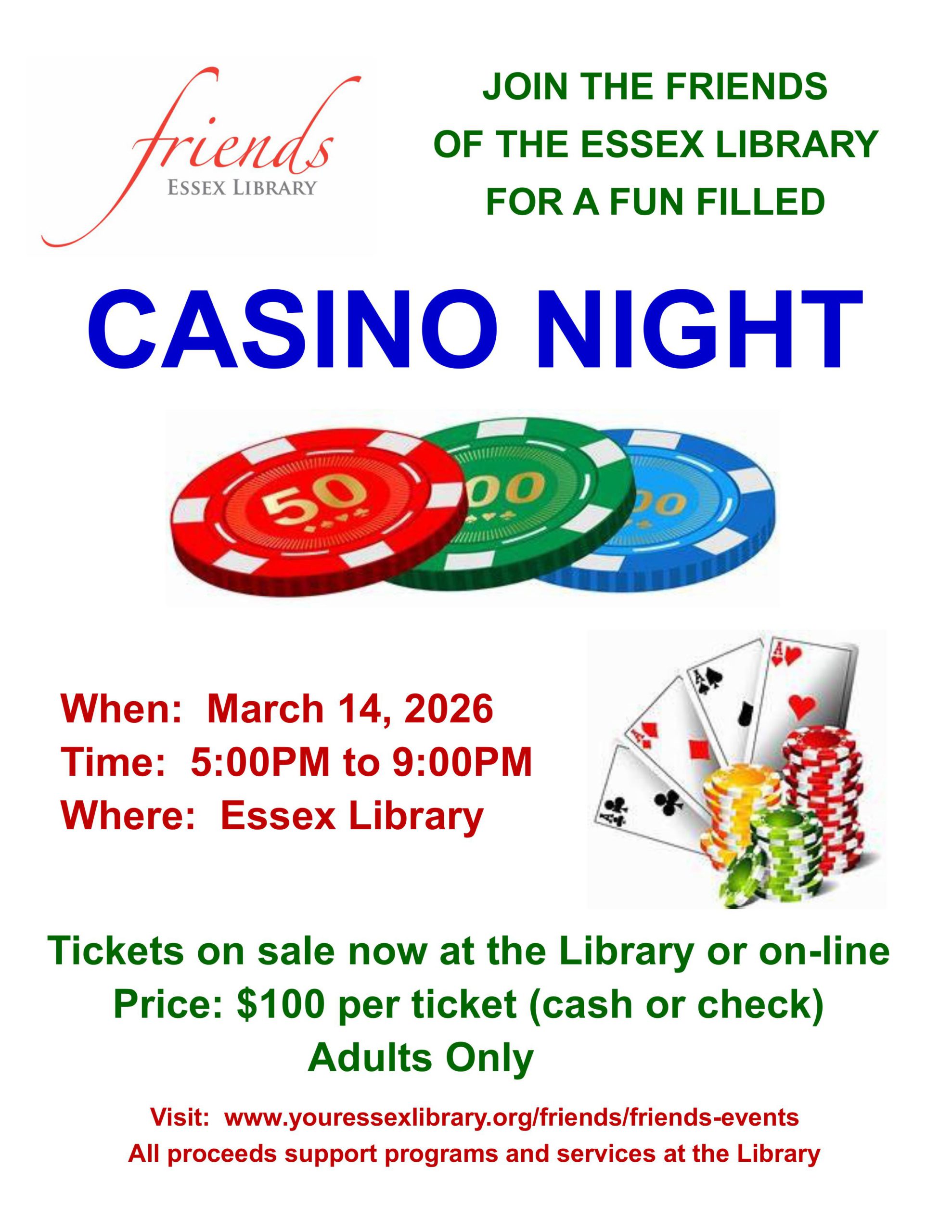 The second annual Casino Night at the Essex Library will be held on Saturday, March 14th, from 5:00-9:00 pm. The price is $100 per ticket (adults only), and will include hearty hors d’oeuvres, wine, beer, light cocktails and soft drinks.
